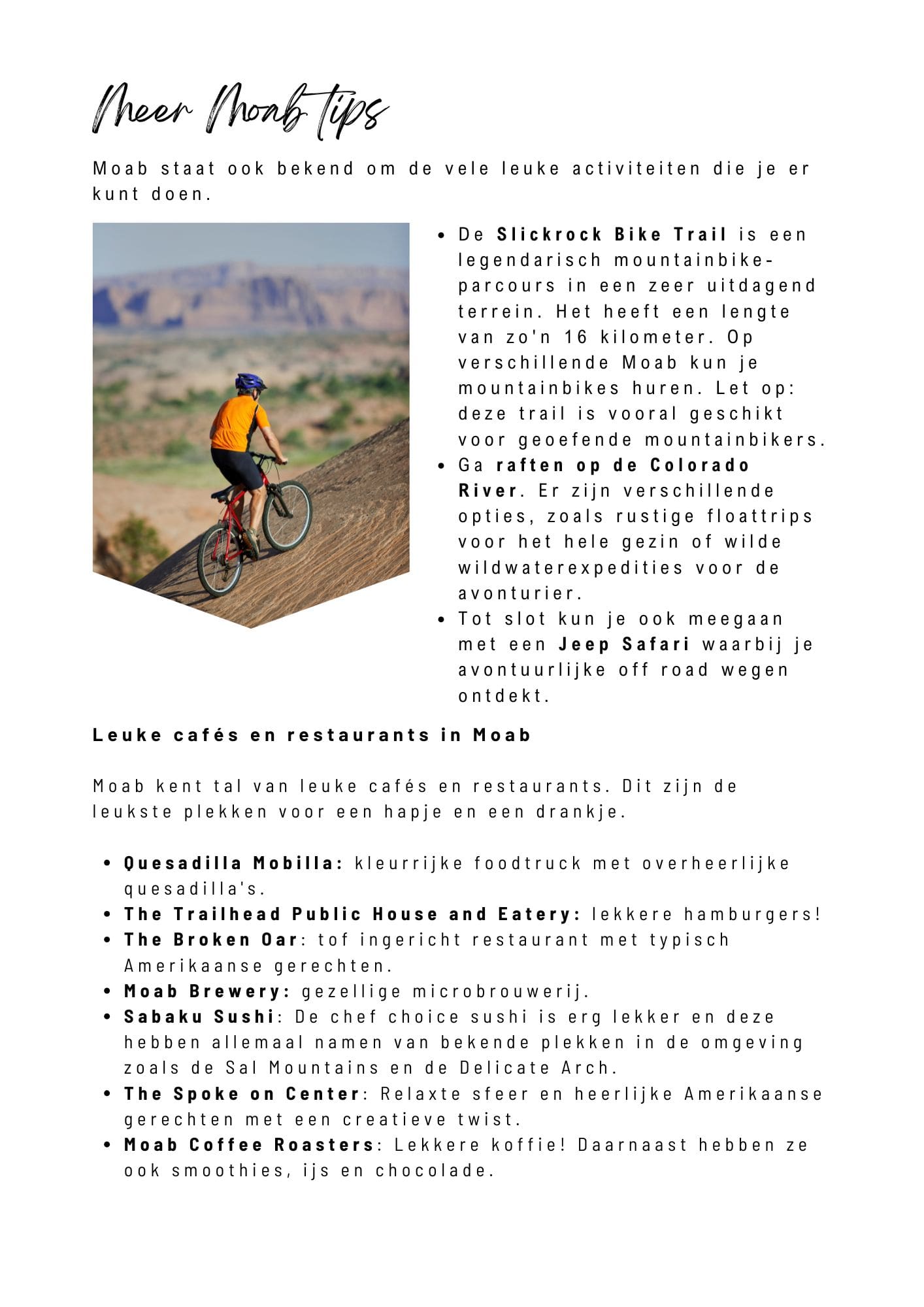• Twee pagina’s met de mooiste bezienswaardigheden en leuke restaurants in Moab